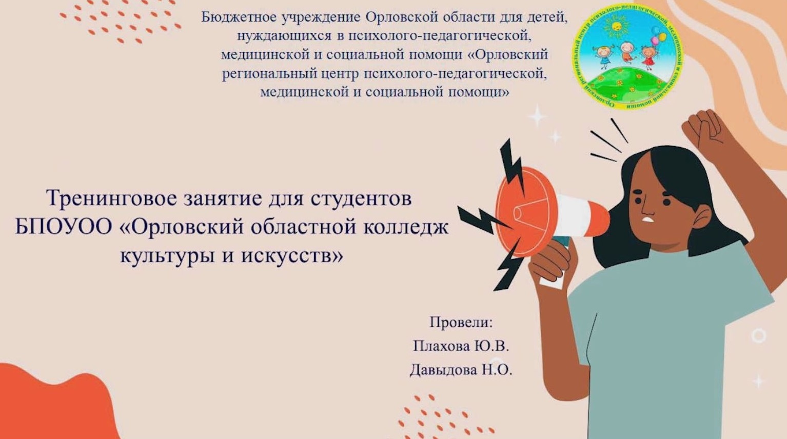 На методическом часе было продемонстрировано и проанализировано тренинговое занятие для студентов БПОУ ОО «Орловский областной колледж культуры и искусств», которое провели специалисты Центра: педагог-психолог Давыдова Николь Олеговна и социальный педагог Плахова Юлия Владимировна.